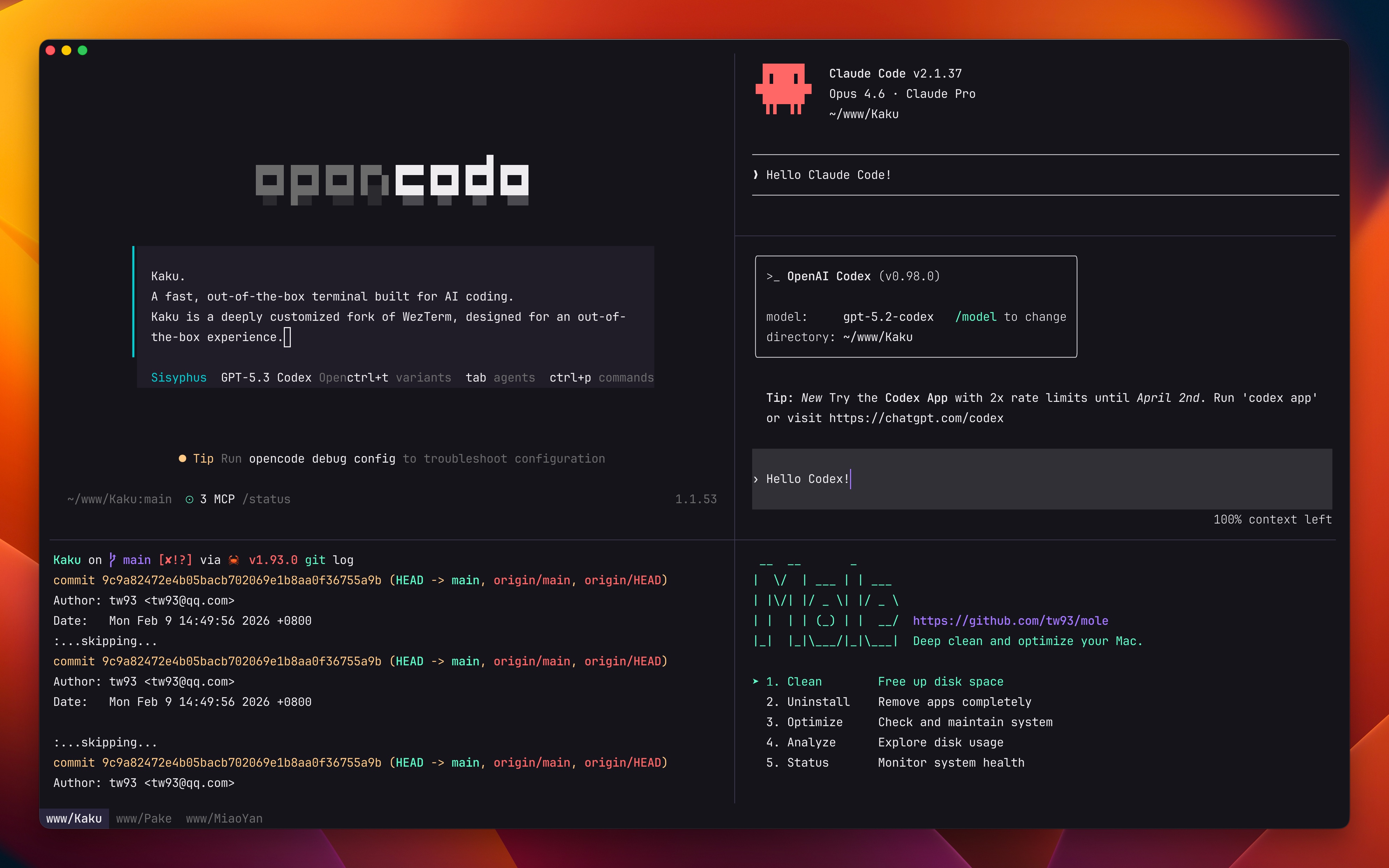 Kaku 是由知名开源作者 Tw93(Pake、Mole 的作者)打造的一款现代终端模拟器。它基于 WezTerm 深度定制 fork 而来,保留了 WezTerm 强大的 Lua 脚本引擎,同时大幅瘦身优化,做到了开箱即用。