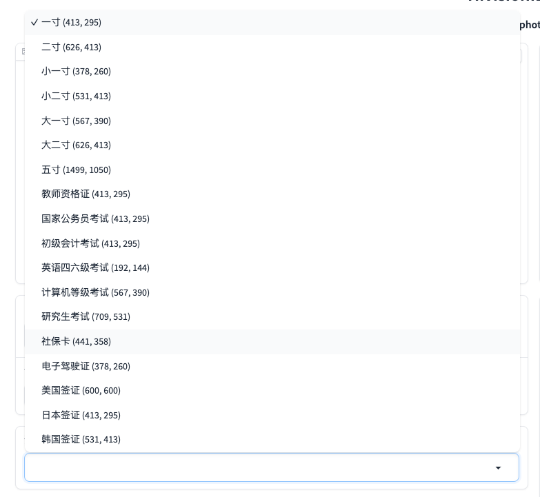 多尺寸选择:提供多种标准证件照尺寸选项,从常见的1寸、2寸到六寸排版照,应有尽有。