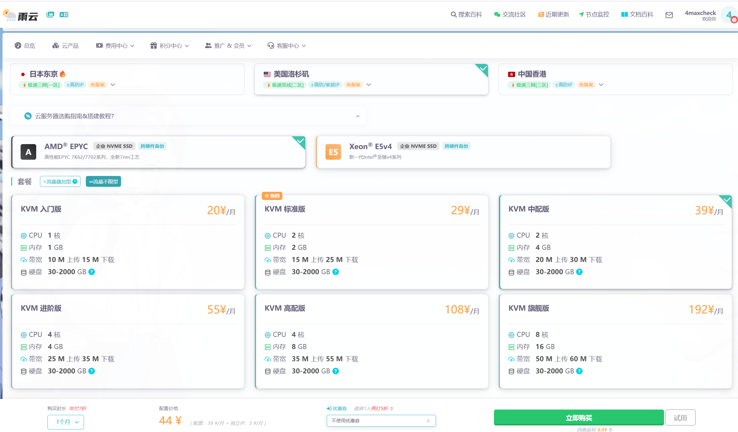 44¥(划算便宜,稳定性良好)https://www.rainyun.com/NzM1MTc0_