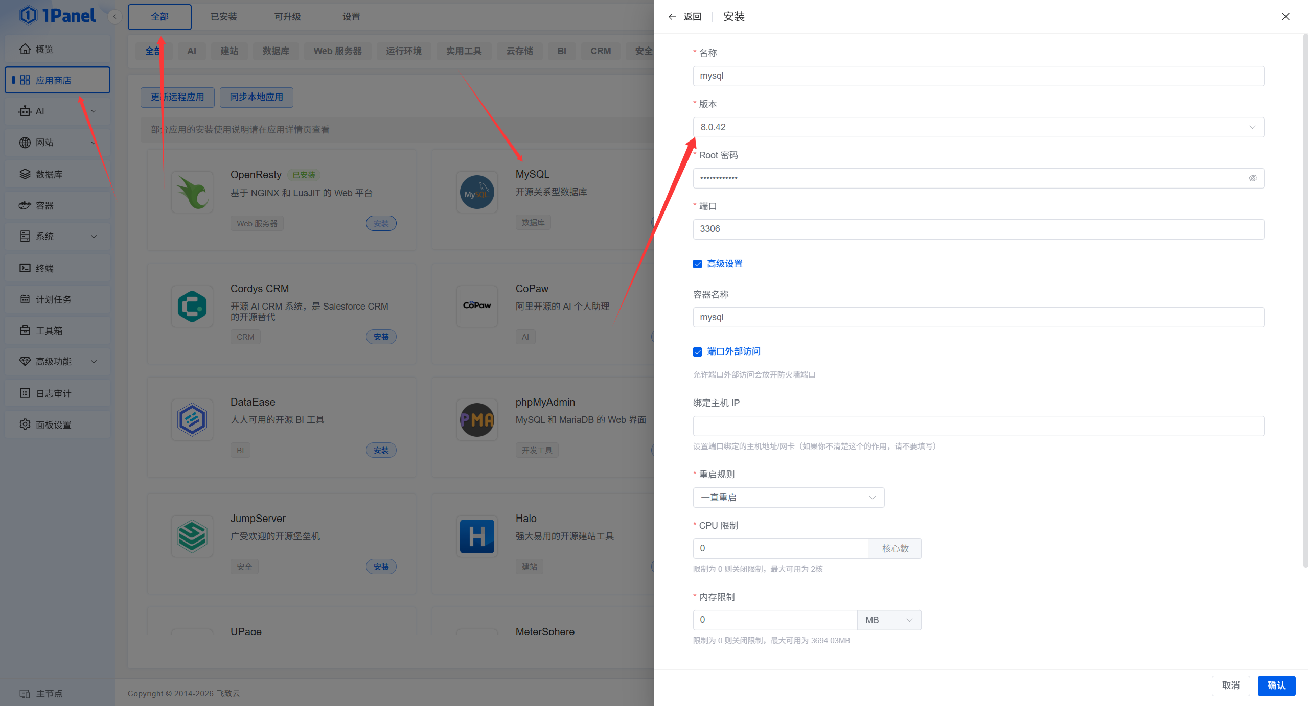 8.0.42版本,一定要勾选上端口外部访问