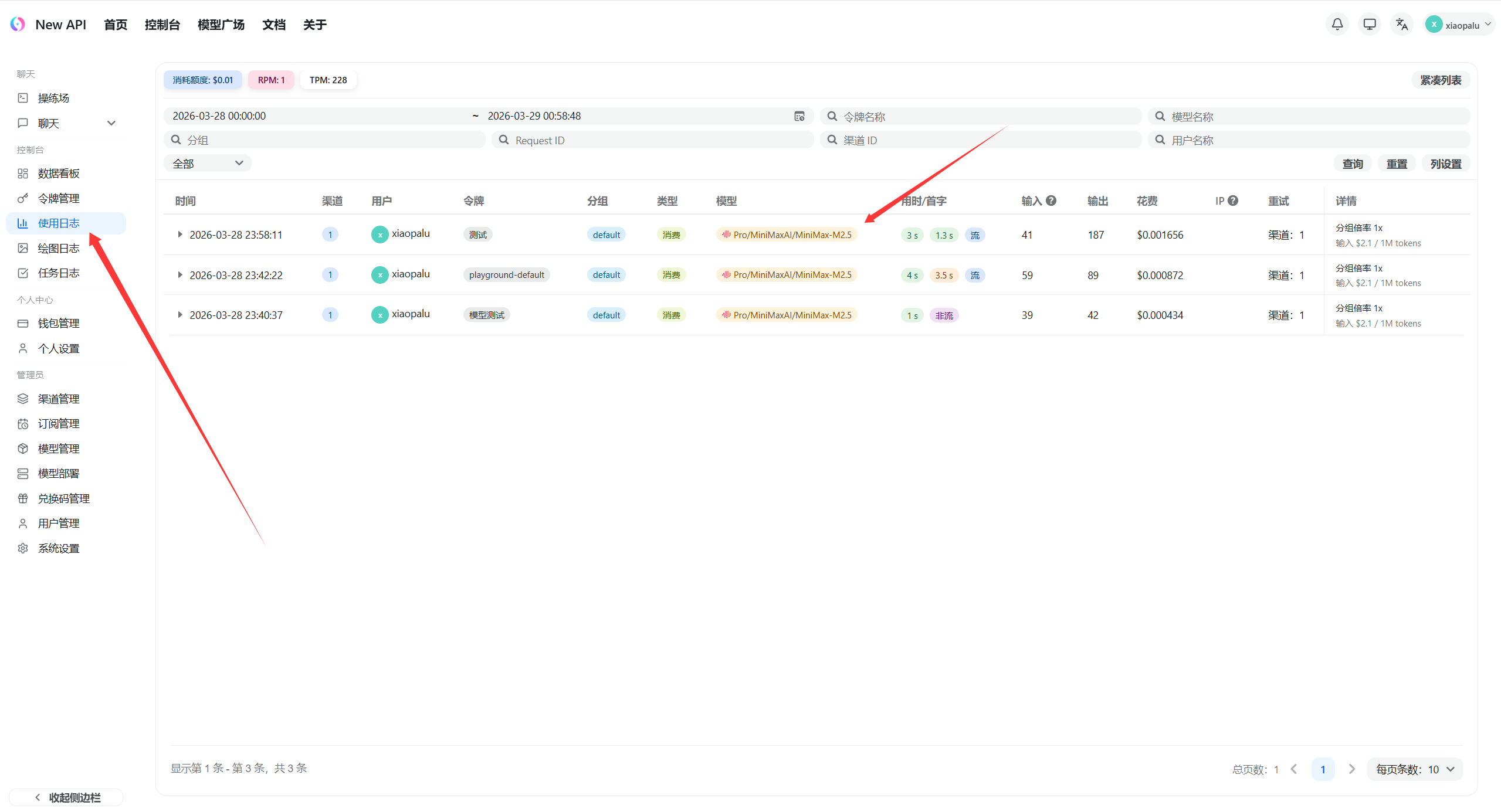 NewAPI中查看调用记录
