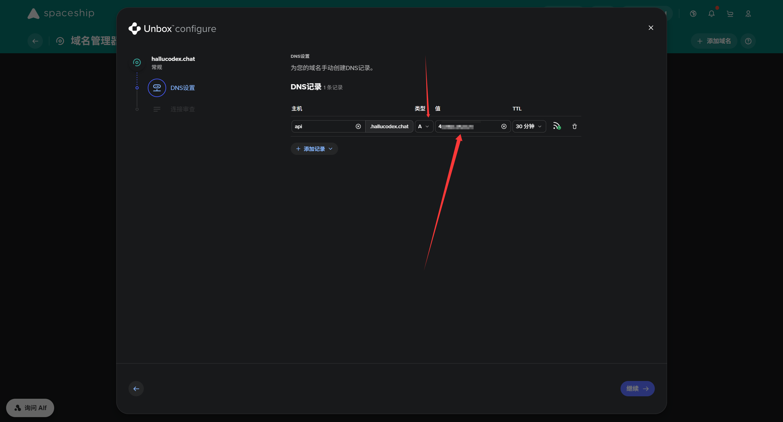 域名:填写与你A记录一致的前缀