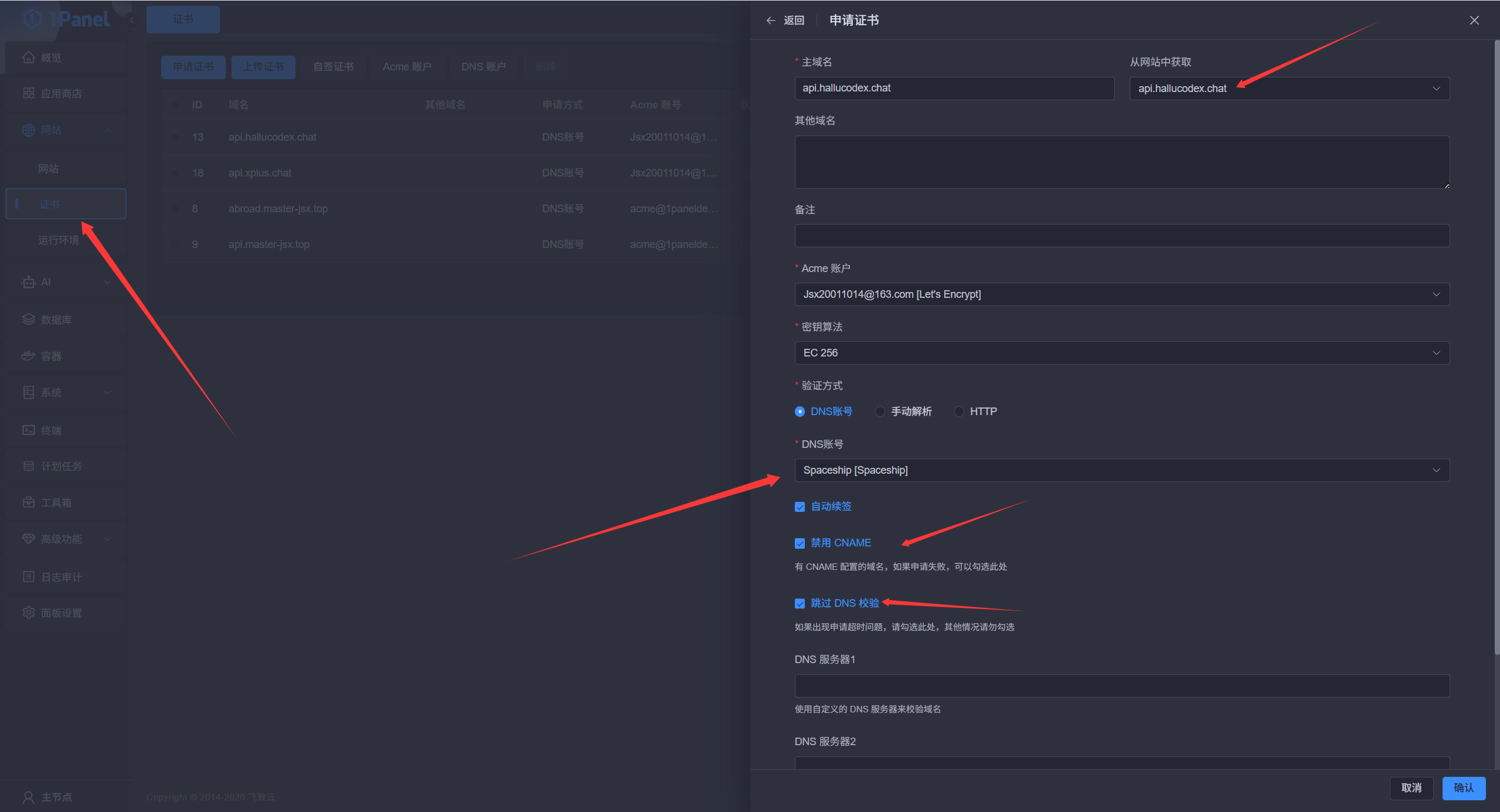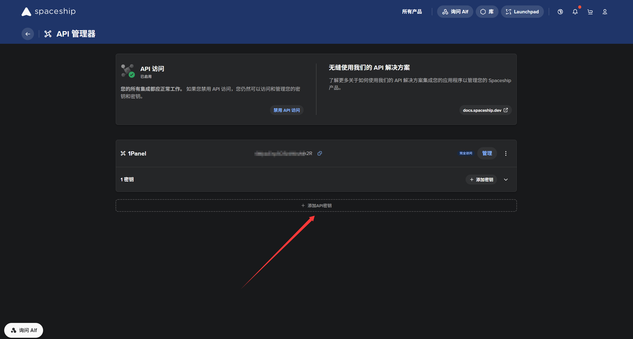 API用于我们的1Panel设置DNS账户使用https://www.spaceship.com/zh/application/api-manager/ 创建好之后 记得保存,只会显示一次