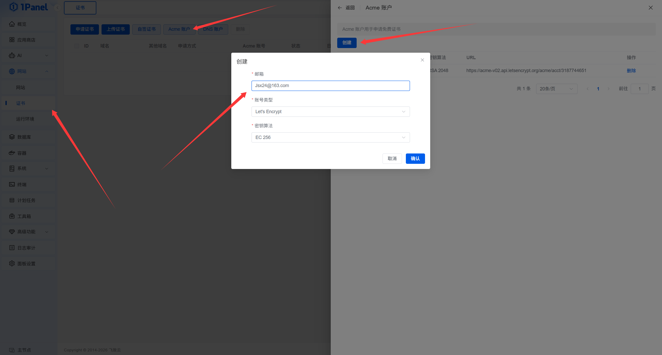 创建 Acme 账户,填入邮箱就好