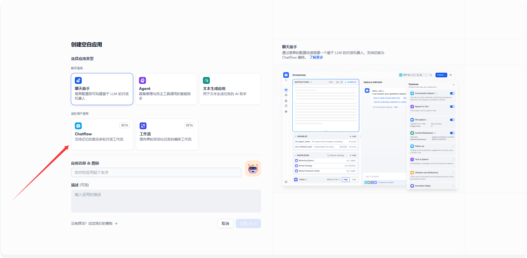 选择 [工作室]-[创建空白应用]-[Chatflow]