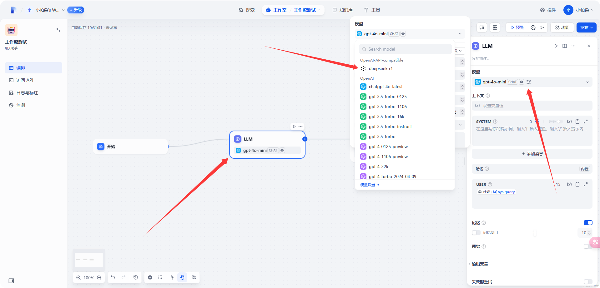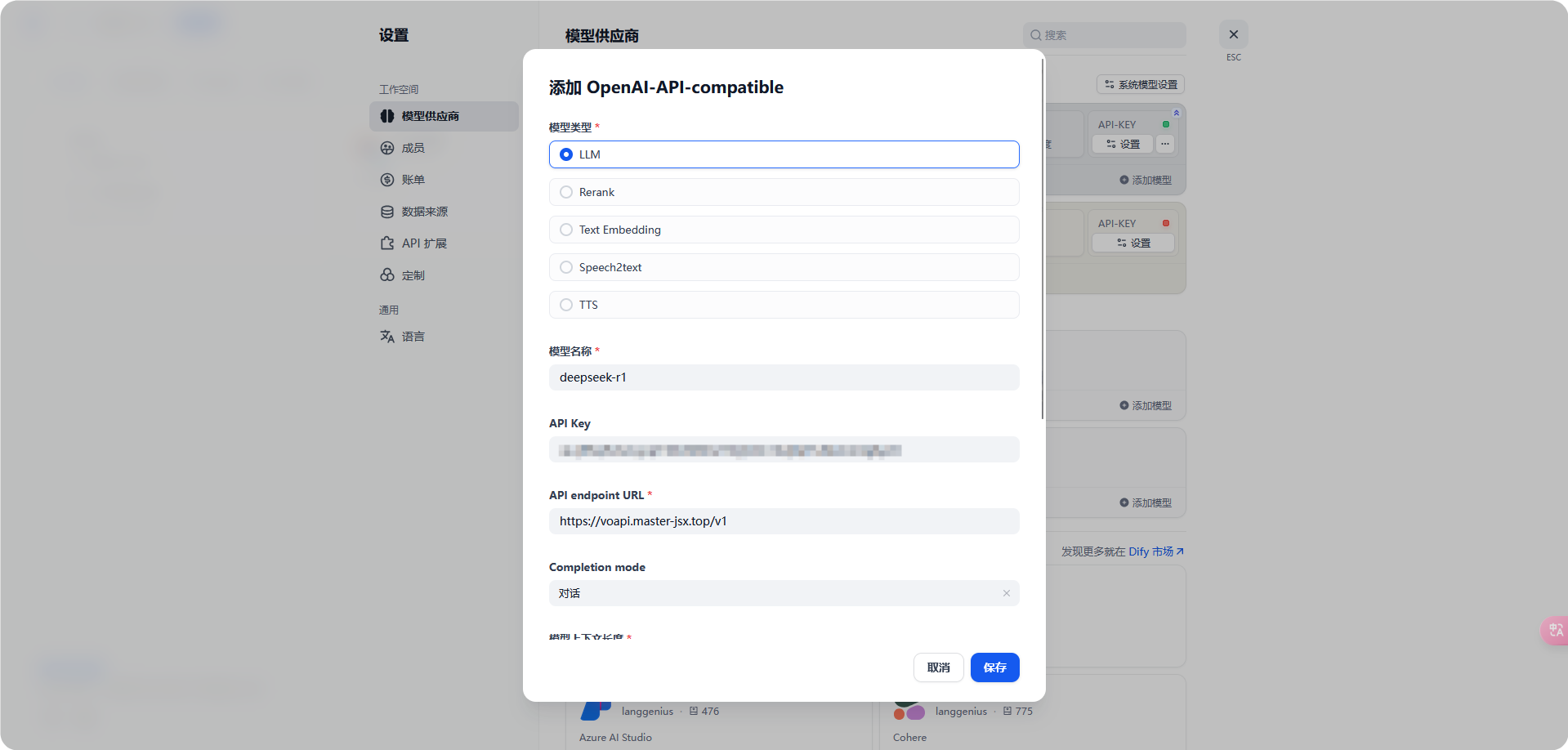 选择 [LLM]-[模型]-[deepseek-r1]