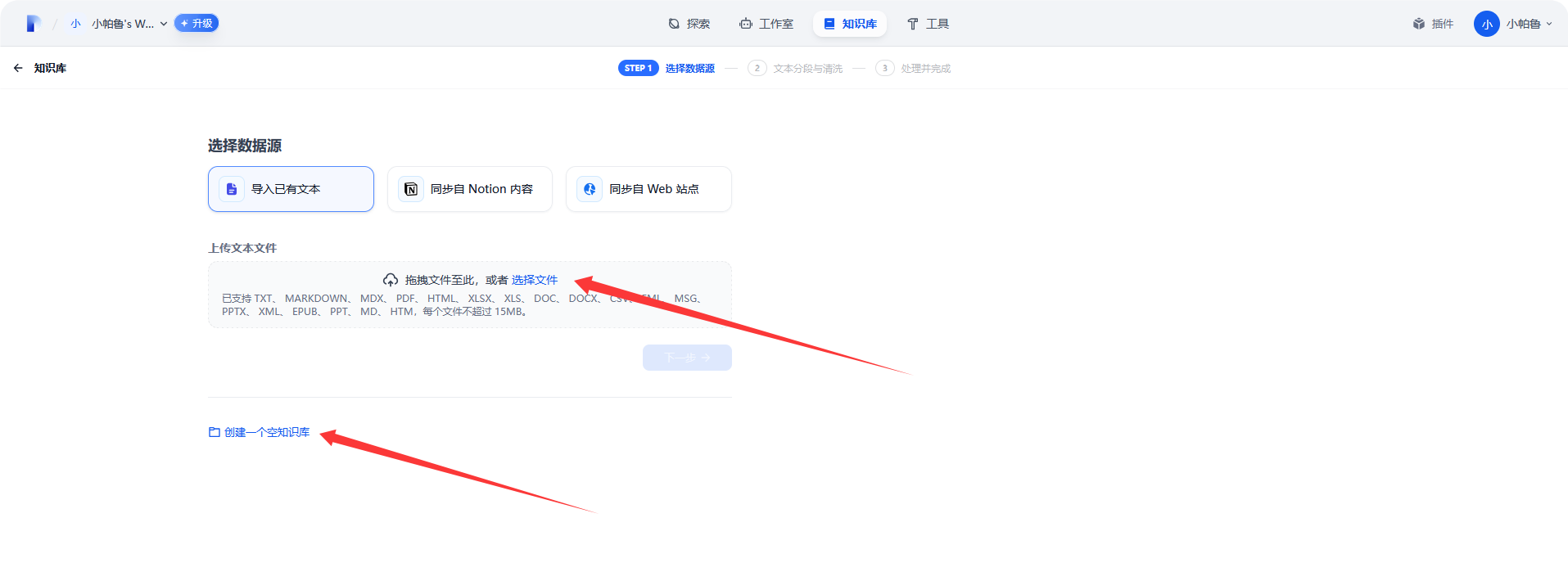 选择 [创建知识库]-[可导入现有文本]/[可创建空的书知识库]-[默认分段即可]