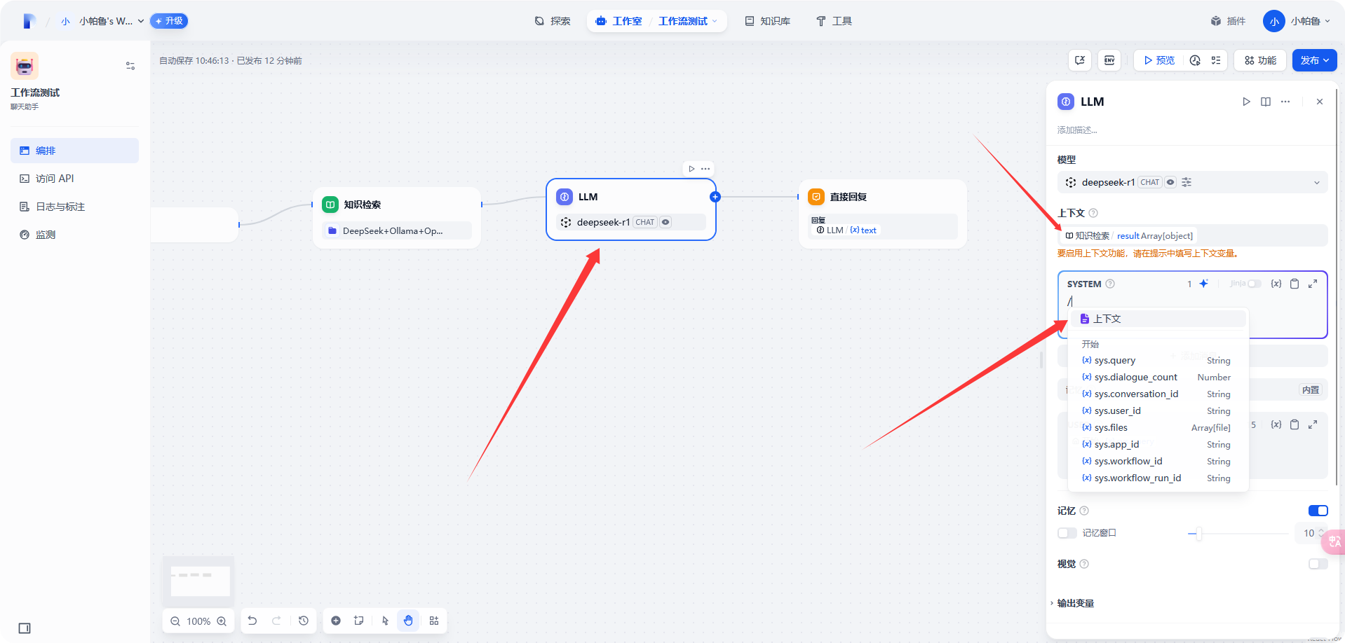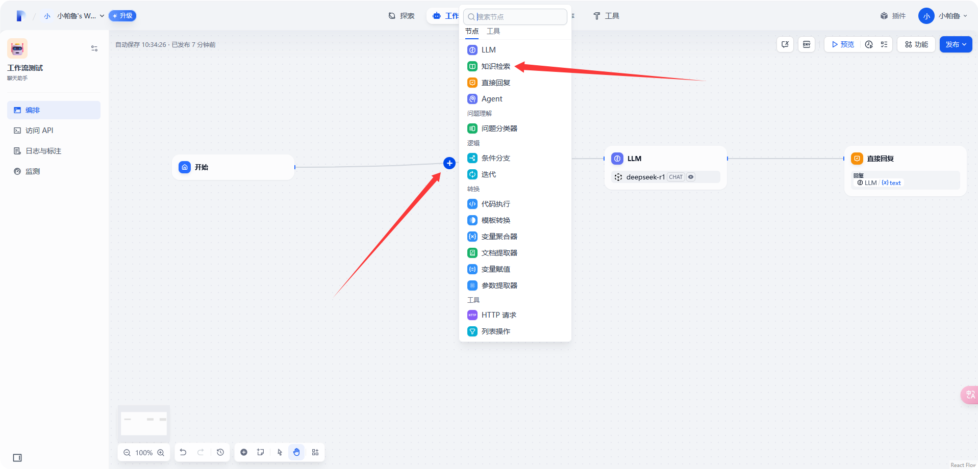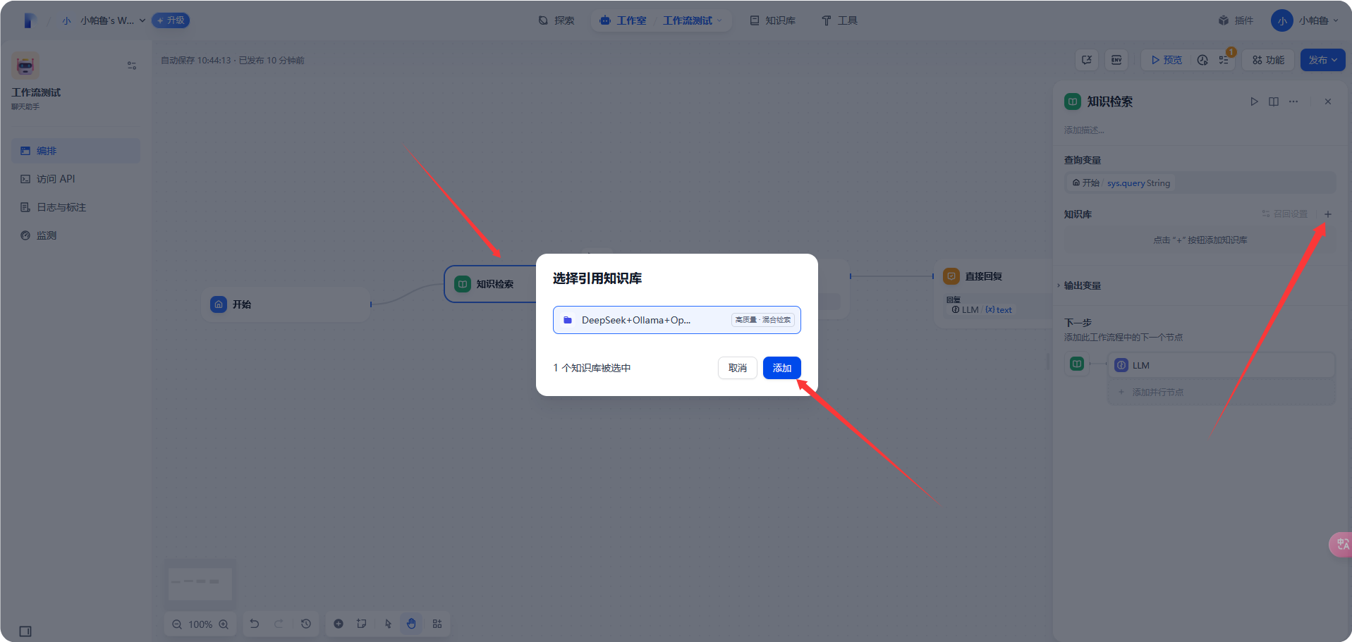 选择 [工作室]-[选择创建好的工作流]-[插入知识检索]