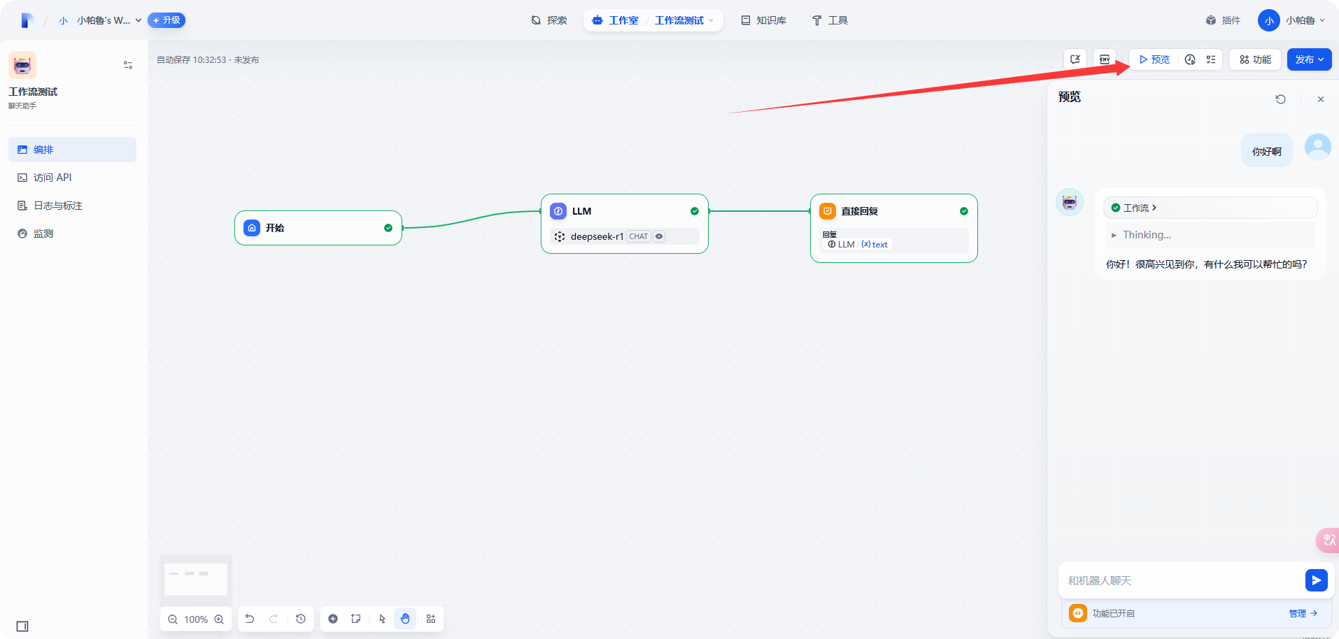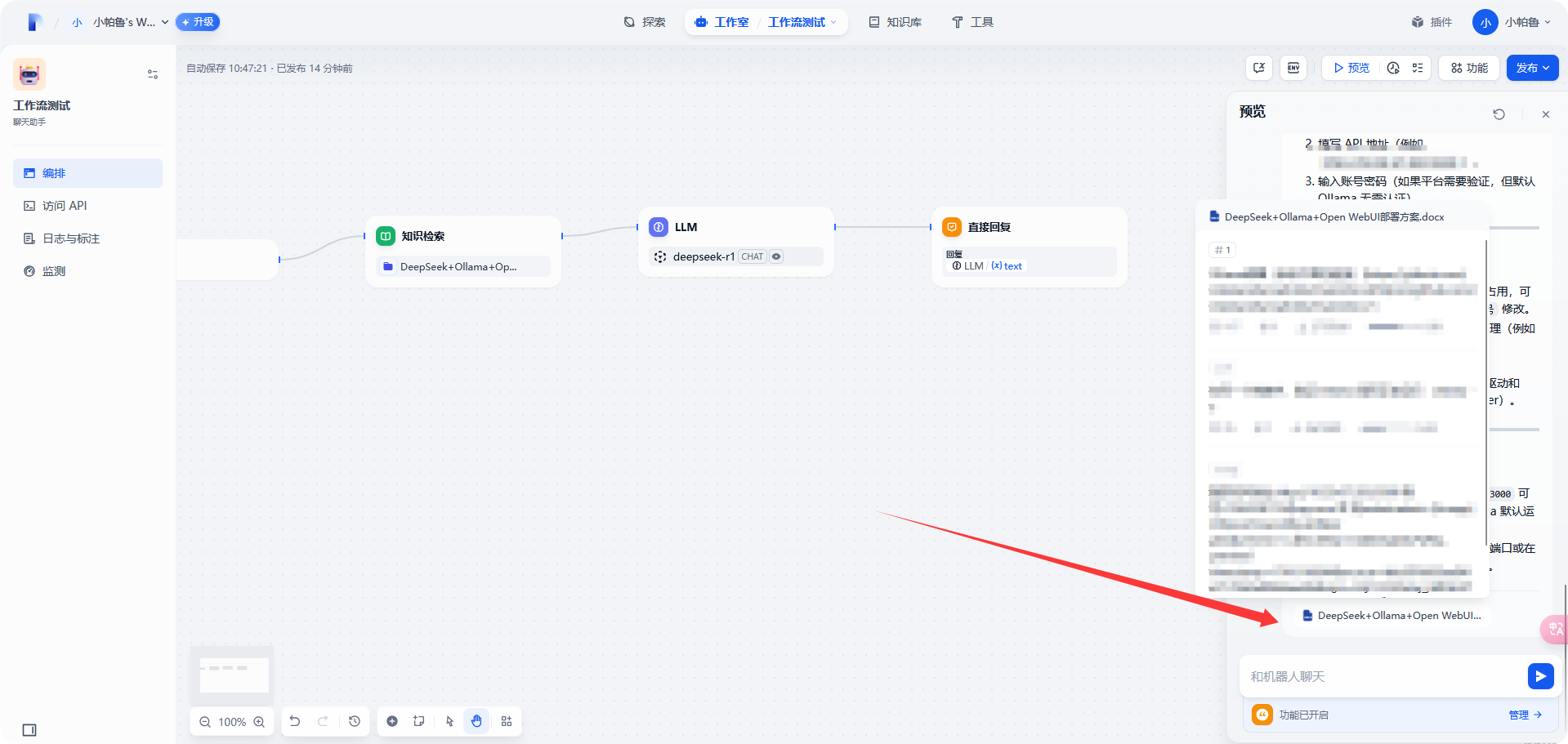 点击 [预览]-[输入知识库内容]-[验证是否可以检索到内容]-[发布]