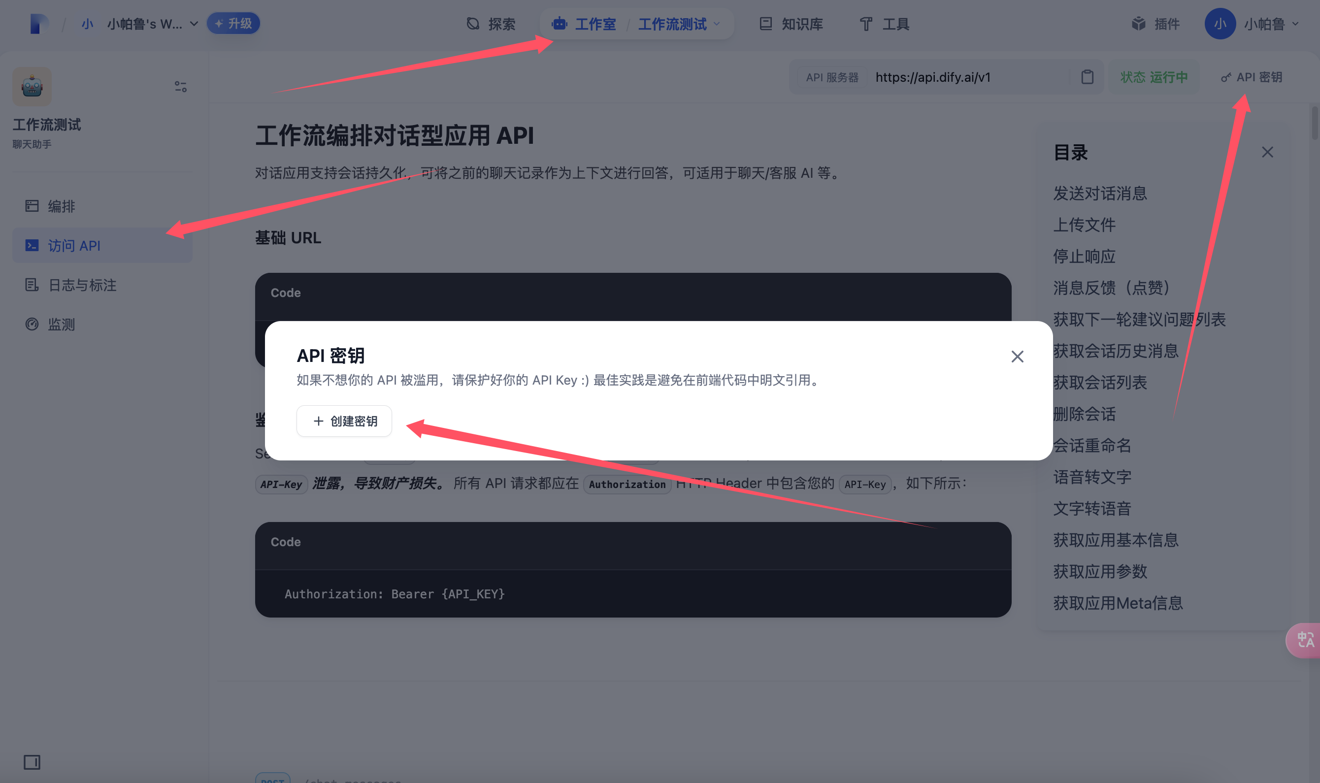 选择 [工作室]-[选择我们创建好的工作流]-[访问API]-[创建秘钥]